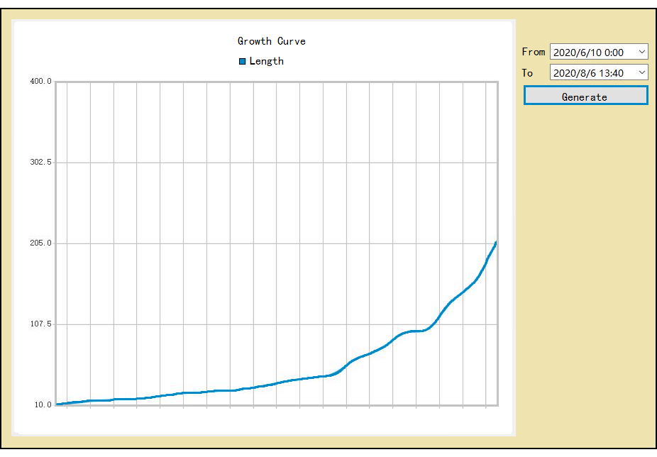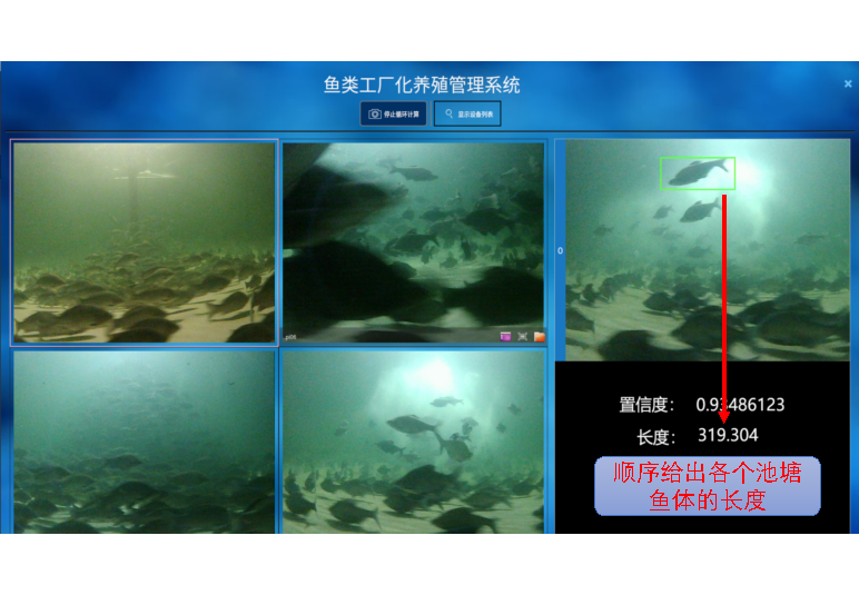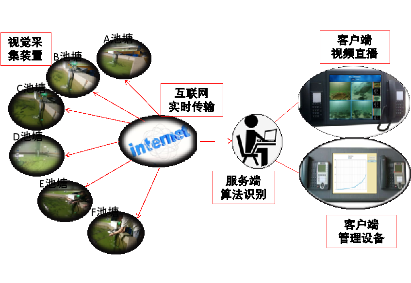 采用立體視覺下動態魚體尺寸測量方法,通過三維重建、魚體檢測與分割、三維點數據處理來獲取多條魚在自由活動時的外形尺寸,避免了接觸采集對魚類生長的干擾。 整個系統由視覺采集裝置、互聯網實時傳輸、服務端算法識別、客戶端直播以及管理設備組成。 后臺系統管理多個魚塘的數據,添加/刪除設備,繪制數據曲線。
